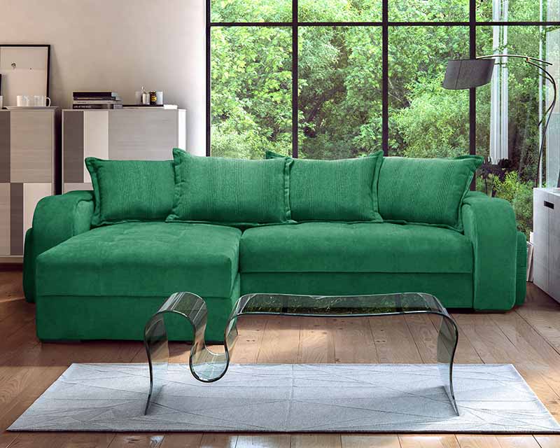 Canapea cu șezlong 2+1 locuri extensibilă – Sistem de extensie spătar rabatabil și șezut culisant cu rotile