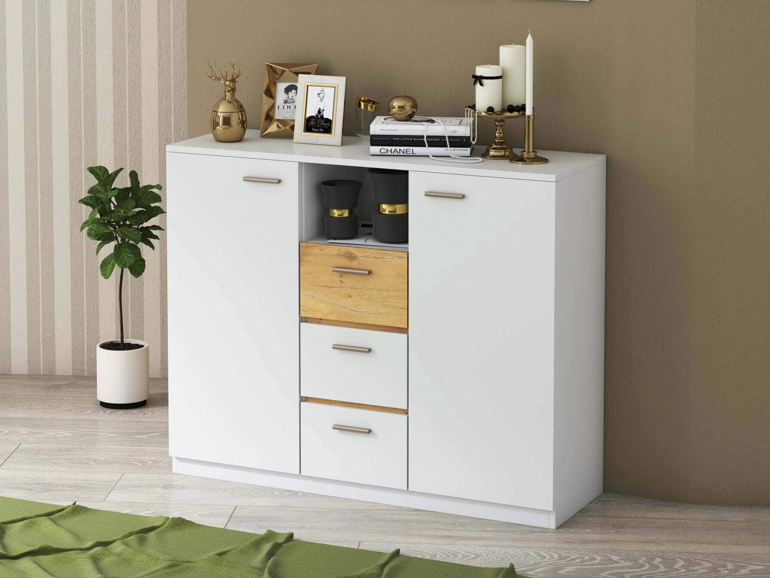 Eleganță Naturală: Culoarea albă a comodei subliniază frumusețea naturală a lemnului sau a altui material din care este fabricată. Aceasta poate adăuga o notă de eleganță și luminozitate în spațiul în care este plasată.