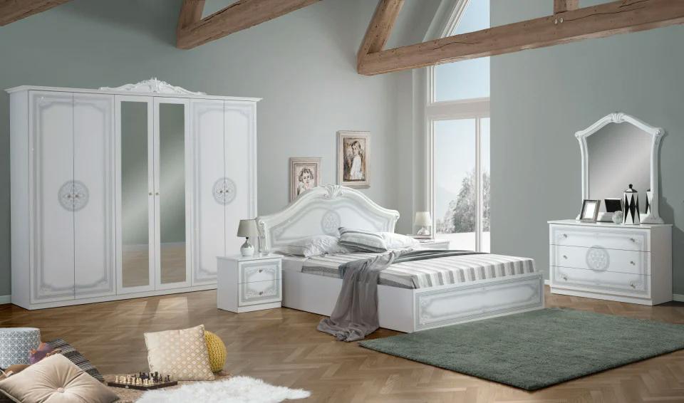 Mobilier Cu Detalii Impunătoare: Patul matrimonial este o piesă centrală cu un cadru impunător și detalii decorative bogate. Comoda cu oglindă este însoțită de noptiere funcționale și un dulap spațios cu bara de haine și polite.