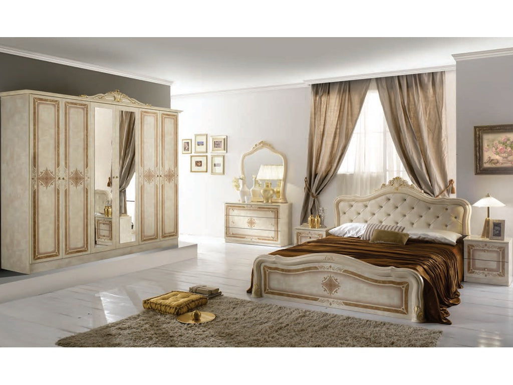 Configurație Completă: Dormitorul "Luisa" vine într-o configurație completă, care include un pat matrimonial confortabil, un dulap spațios cu bara de haine și polite pentru organizarea eficientă a hainelor, 2 noptiere pentru depozitarea obiectelor personale și o comodă cu oglindă pentru un spațiu suplimentar de depozitare și pentru a vă aranja aspectul personal.