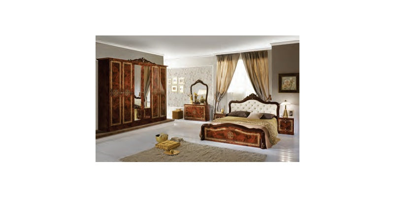 Configurație Completă: Dormitorul "Luisa" vine într-o configurație completă, care include un pat matrimonial confortabil, un dulap spațios cu bara de haine și polite pentru organizarea eficientă a hainelor, 2 noptiere pentru depozitarea obiectelor personale și o comodă cu oglindă pentru un spațiu suplimentar de depozitare și pentru a vă aranja aspectul personal.